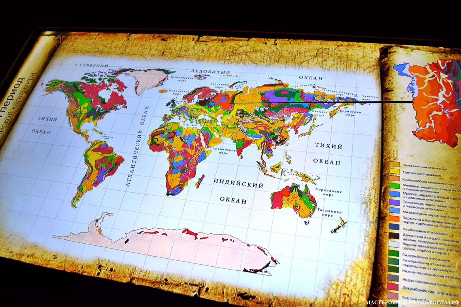 Мир пермского периода был и похож, и в то же время совершенно не похож на современный. Начнем с того, что всю сушу в то время можно было обойти пешком, не замочив ног. Выйти в путь, например, в Восточной Сибири и, пройдя последовательно Европу, Северную Америку, Южную Америку, Африку, Антарктиду и Индию, добраться до Австралии. Ведь к тому времени все эти материки сошлись в единый суперконтинент — Пангею. Он занимал Западное полушарие, а в Восточном полушарии не было ничего, кроме океана — Панталассы. Из-за такого положения континентов и материкового оледенения вблизи Южного полюса уровень океана был очень низким, и морские отложения мало где накапливались.