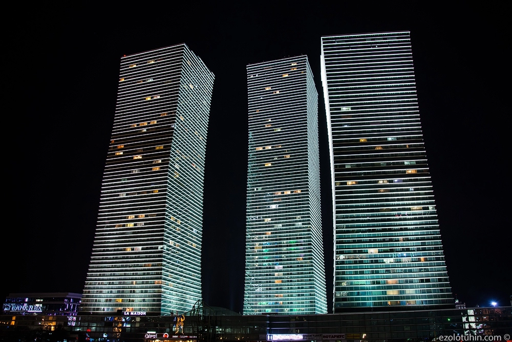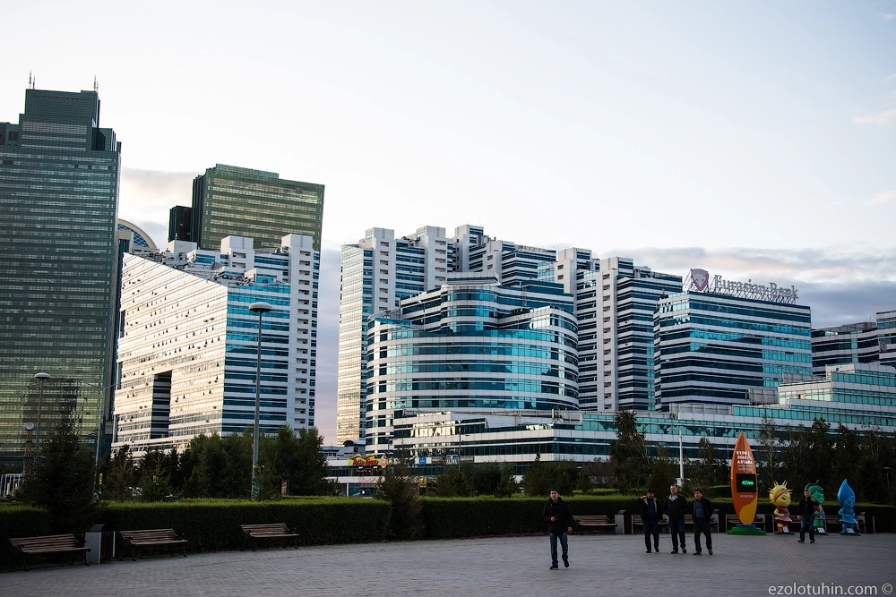 Небоскребы в центре Астаны. Удивительно, как на первых этажах этих гигантских зданий располагаются традиционные рынки, чебуречные и нотариусы. Большинство апартаментов в этих небоскребах оборудованы под посуточную сдачу.