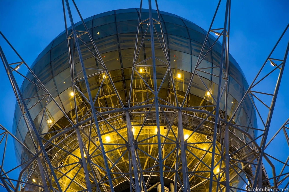 Внутри золотого шара расположены смотровая площадка (абсолютно неудобная и бессмысленная), а также отпечаток руки президента Нурсултана Назарбаева.