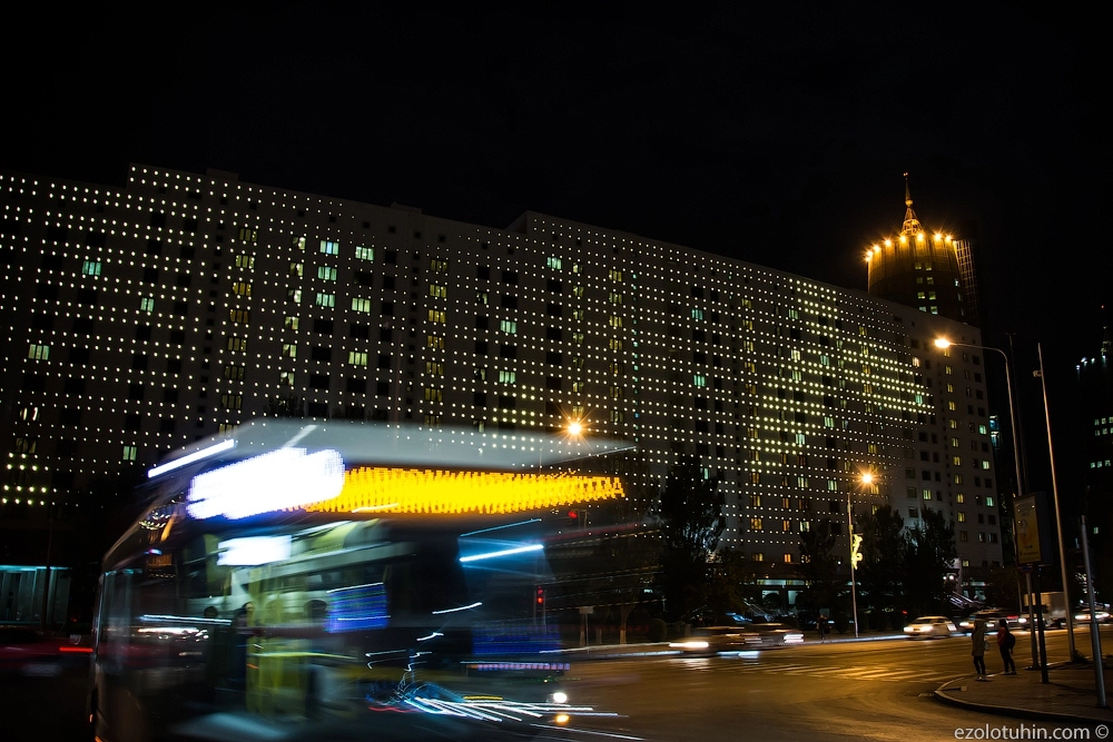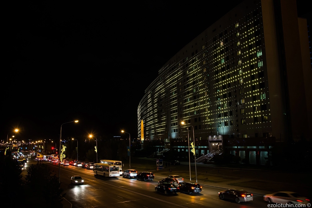 Вид из апартаментов на ночной город. Стройка в центре — будущее самое высокое здание Казахстана и Центральной Азии «Абу-Даби Плаза», к окончанию строительства планируется возвести 75 этажей высотой 382 метра. Строительство башни планировалось завершить в 2016 году. Такие дела.