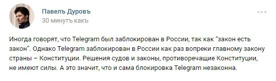 Основатель запрещенного в России мессенджера Telegram Павел Дуров на своей странице в соцсети «ВКонтакте» написал, что мессенджер заблокировали вопреки главному закону страны — Конституции.