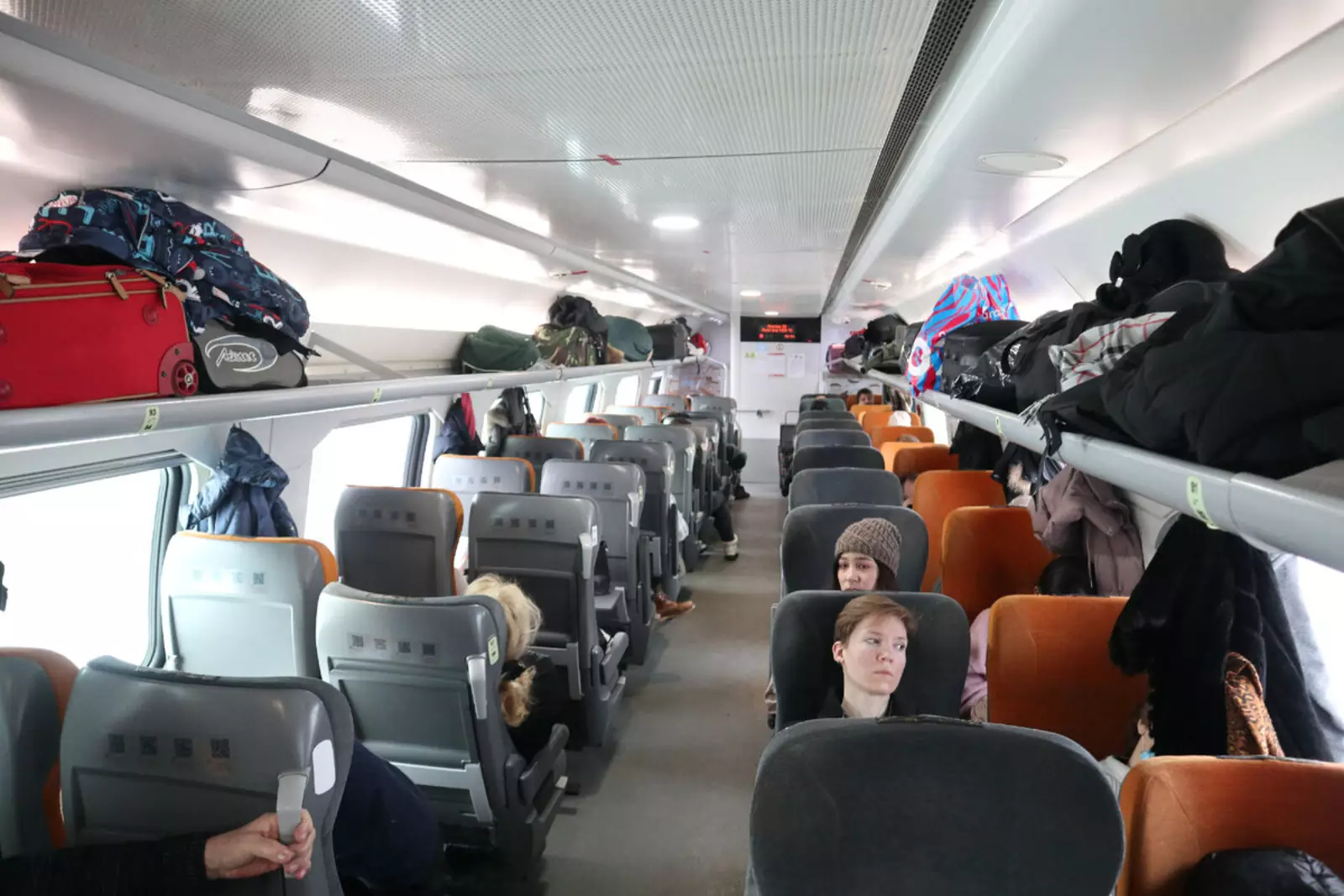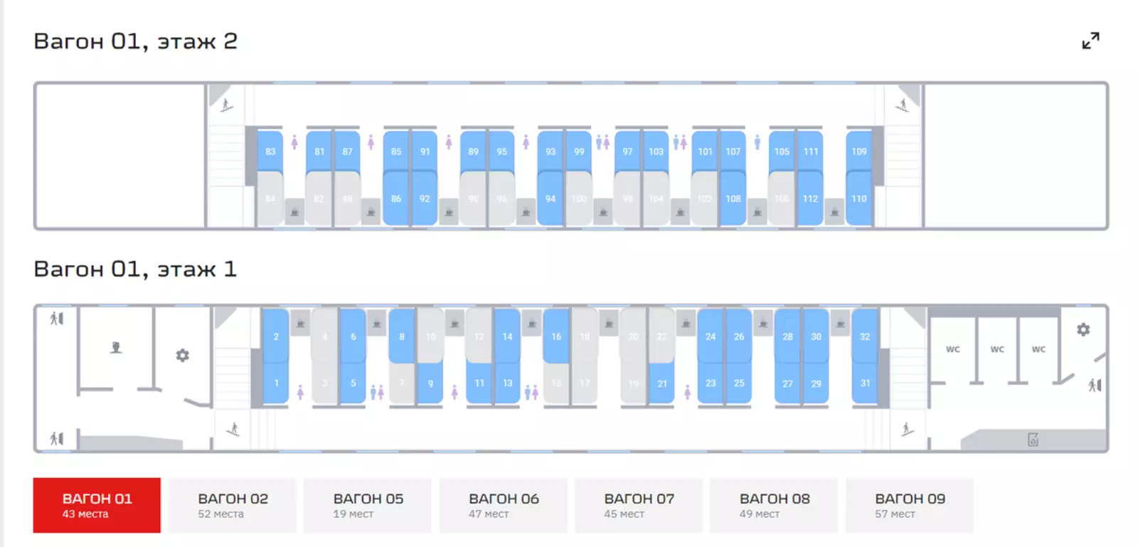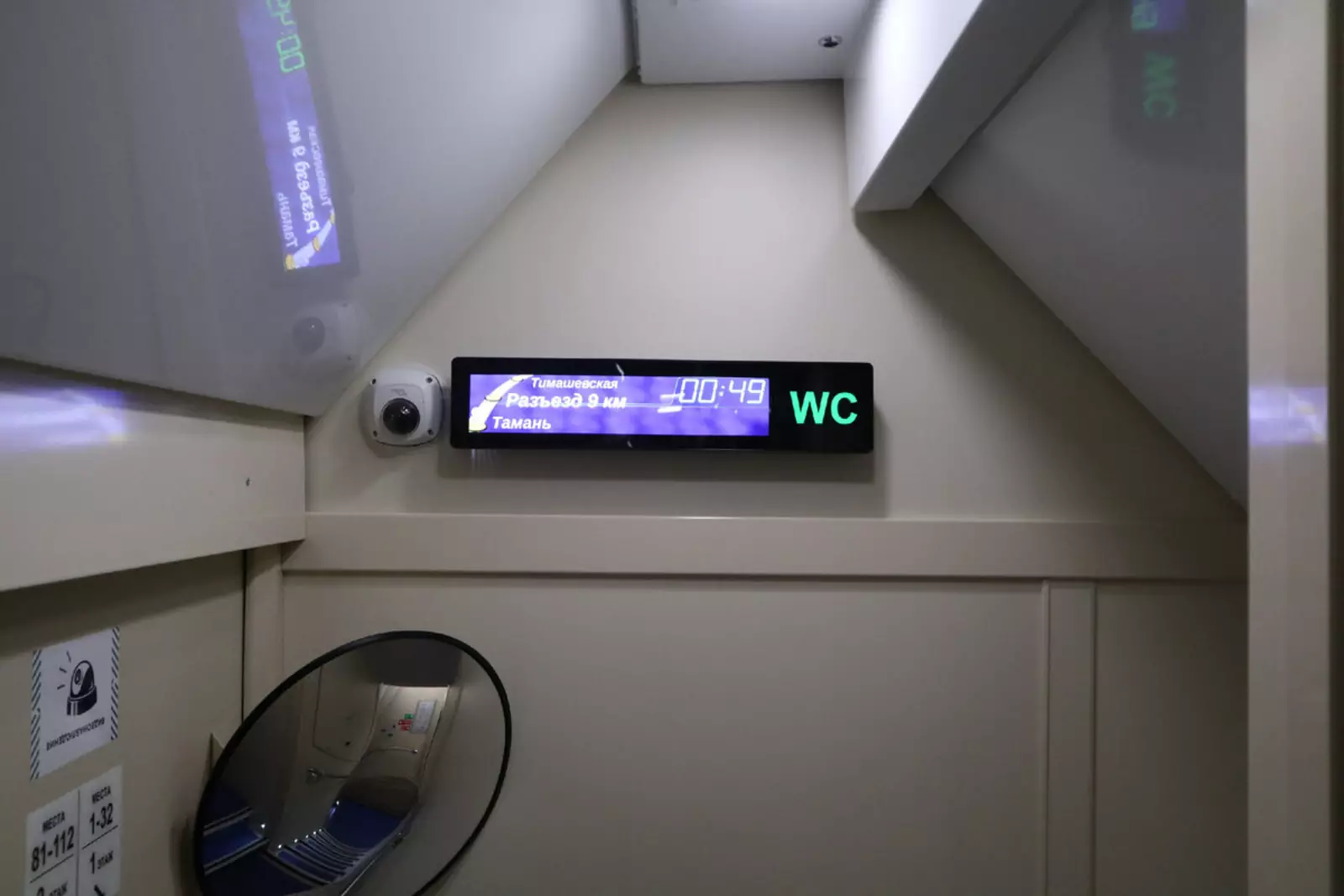 Кстати, туалетов тут три. То есть примерно по одному на 21 пассажира. Это лучше, чем в плацкарте (27 пассажиров на туалет), но хуже, чем в одноэтажном купе (18).
