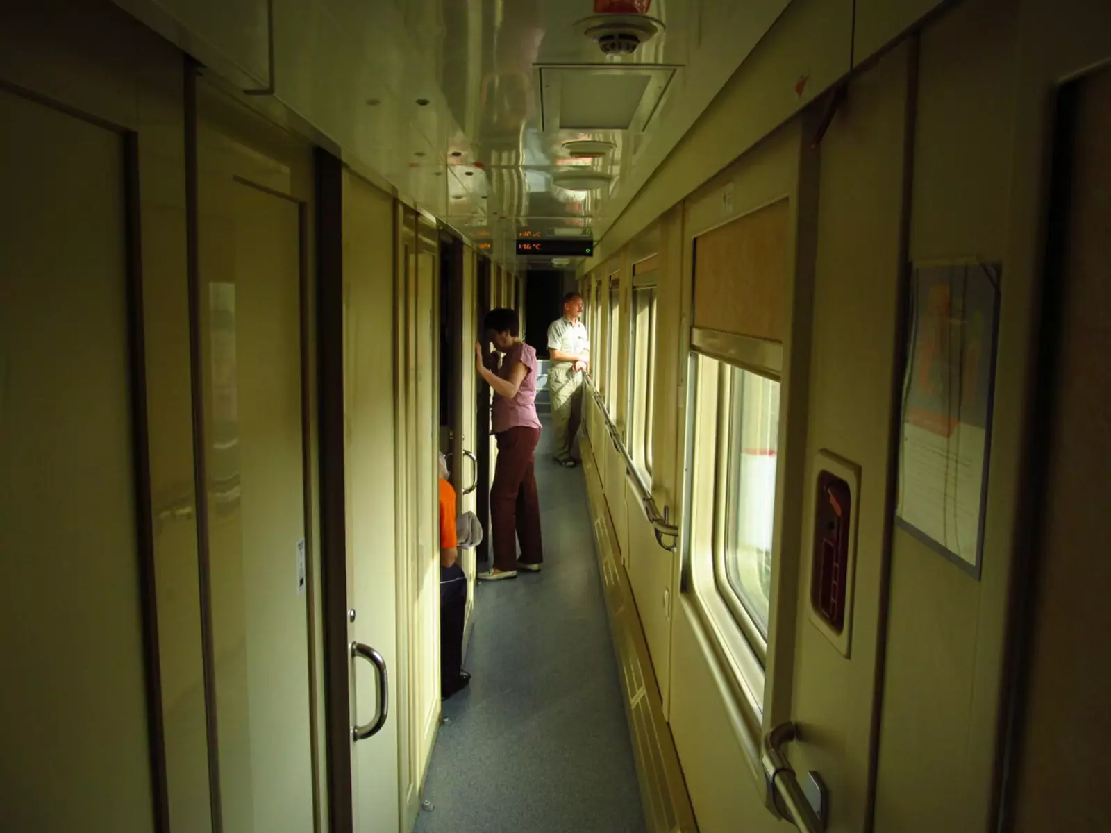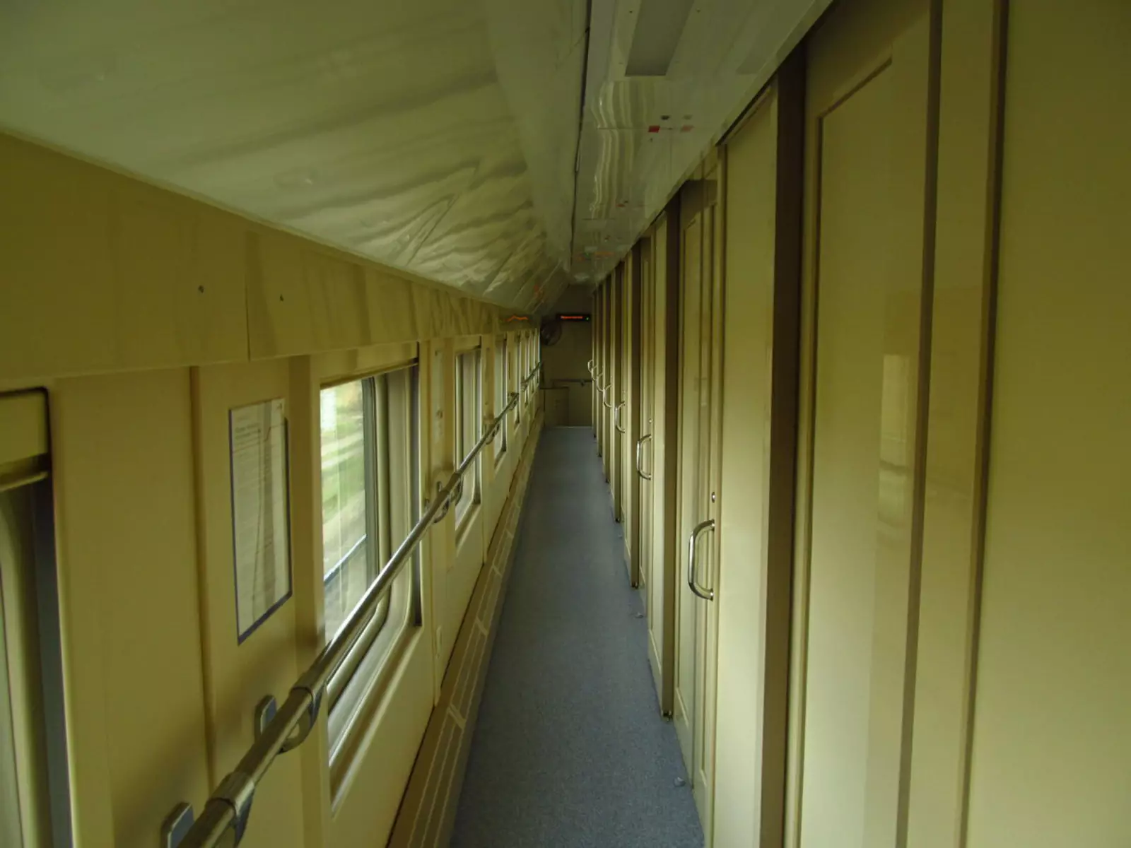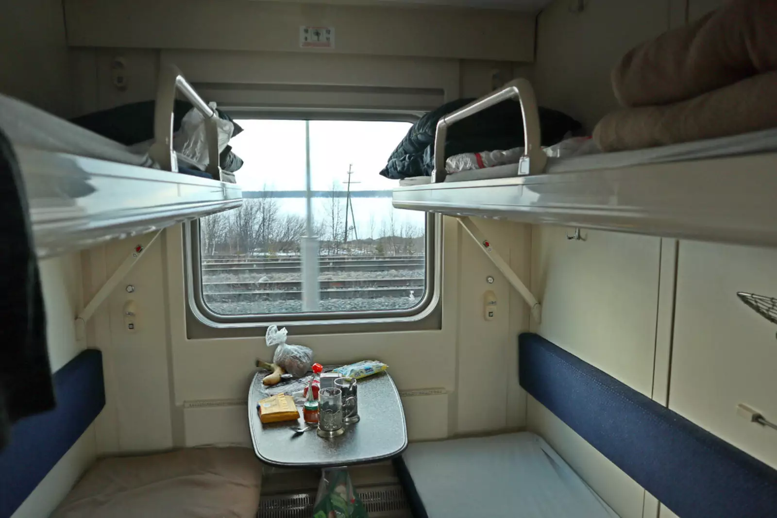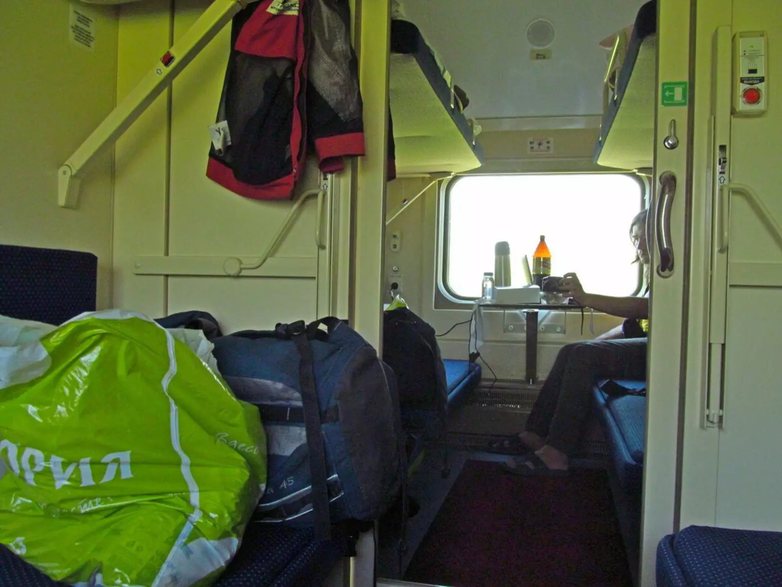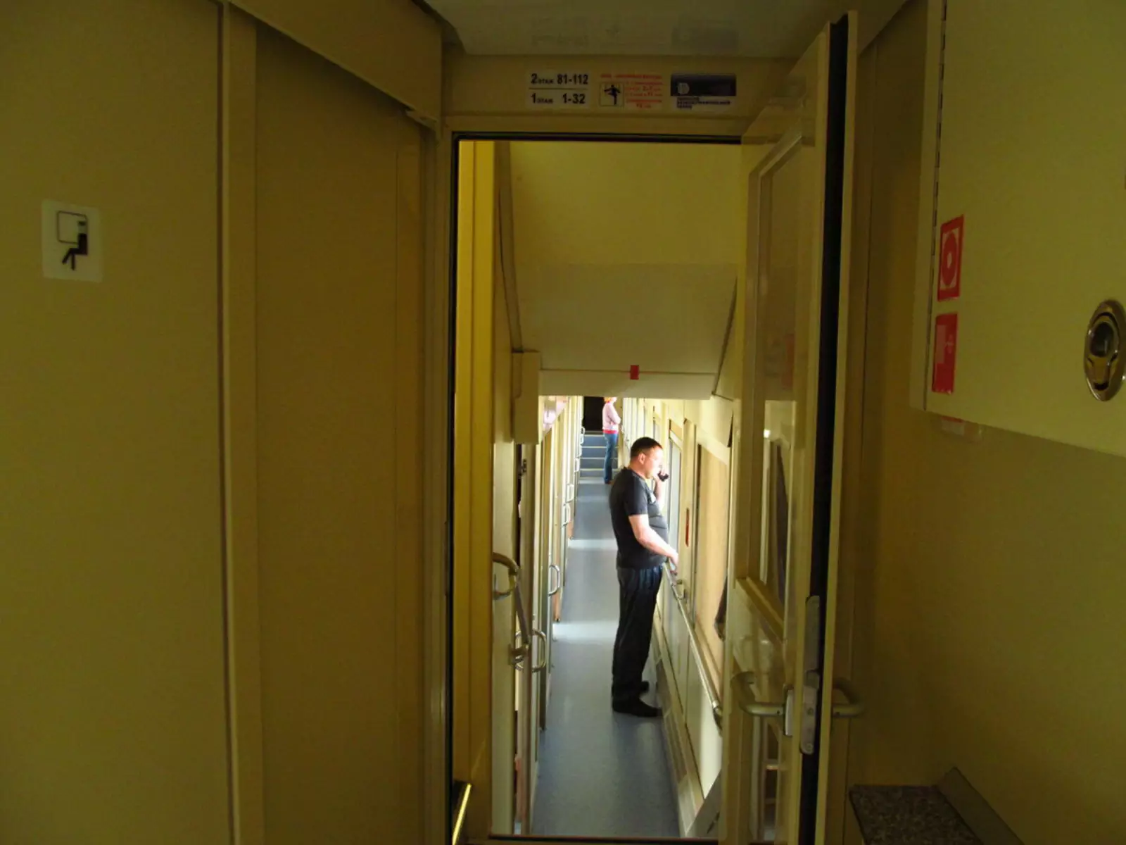 Обратите внимание на верх купе второго этажа. Из-за того, что оно под самой крышей, скос вагона находится прямо над второй полкой. Если вы будете спать головой к окну, то прямо в него упрётесь! Поэтому, когда я там ехал, спал головой к двери.