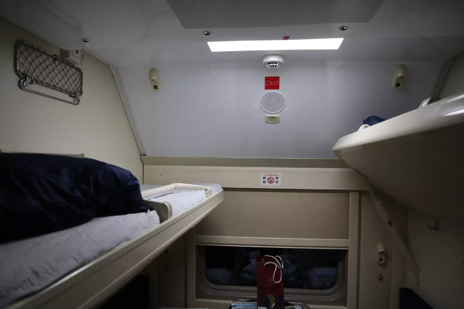 Но, разумеется, есть и нюансы. И главный из них — недостаток места. Очевидно, что двухэтажность «съедает» пространство, и если пассажиры ещё как-то могут с комфортом разместиться, то вот их багаж — уже нет. Той самой легендарной «полки над проходом» или просто третьих полок тут нет в принципе! А пространство под нижними полками меньше, чем в обычном купе (опять же экономия на каждом сантиметре).