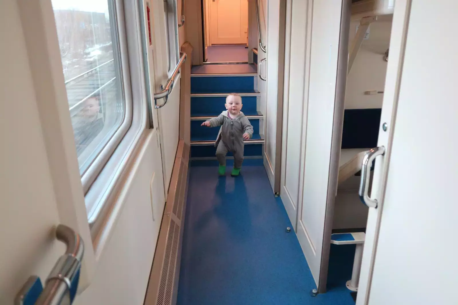 На втором этаже в коридоре не постоишь не помедитируешь на проносящиеся пейзажи. Не, ну если ты ребёнок или карлик, то можно. А если обычный взрослый человек, то сделать это можно лишь присев или сильно скрючившись. Иначе верхняя кромка окна окажется в лучшем случае на уровне подбородка. Ну и классических откидных сидушек тут тоже не предусмотрели (а зря). Выходит, что эти окна на втором этаже вообще мало полезны.
