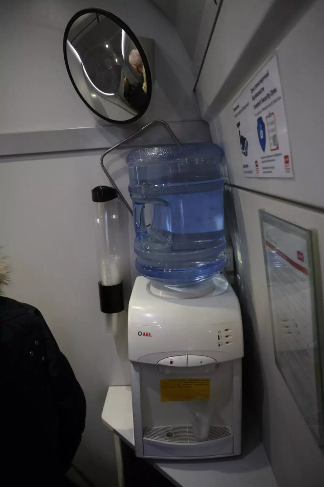 Кстати, о кипятке. Увы, прекрасный титан в двухэтажниках отсутствует. Вместо этого вот такой офисный автомат с полутёплой водой. Иногда отдельный кипятильник есть ещё и у проводника. Но в целом, конечно, с горячей водой тут проблема. Этот автомат быстро опустошается и долго нагревается. А представьте, что 64 человека одновременно захотели заварить себе дошираку?
