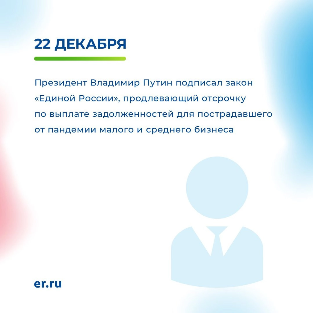 - закон о продлении отсрочки по выплате задолженностей для пострадавшего от пандемии малого и среднего бизнеса;