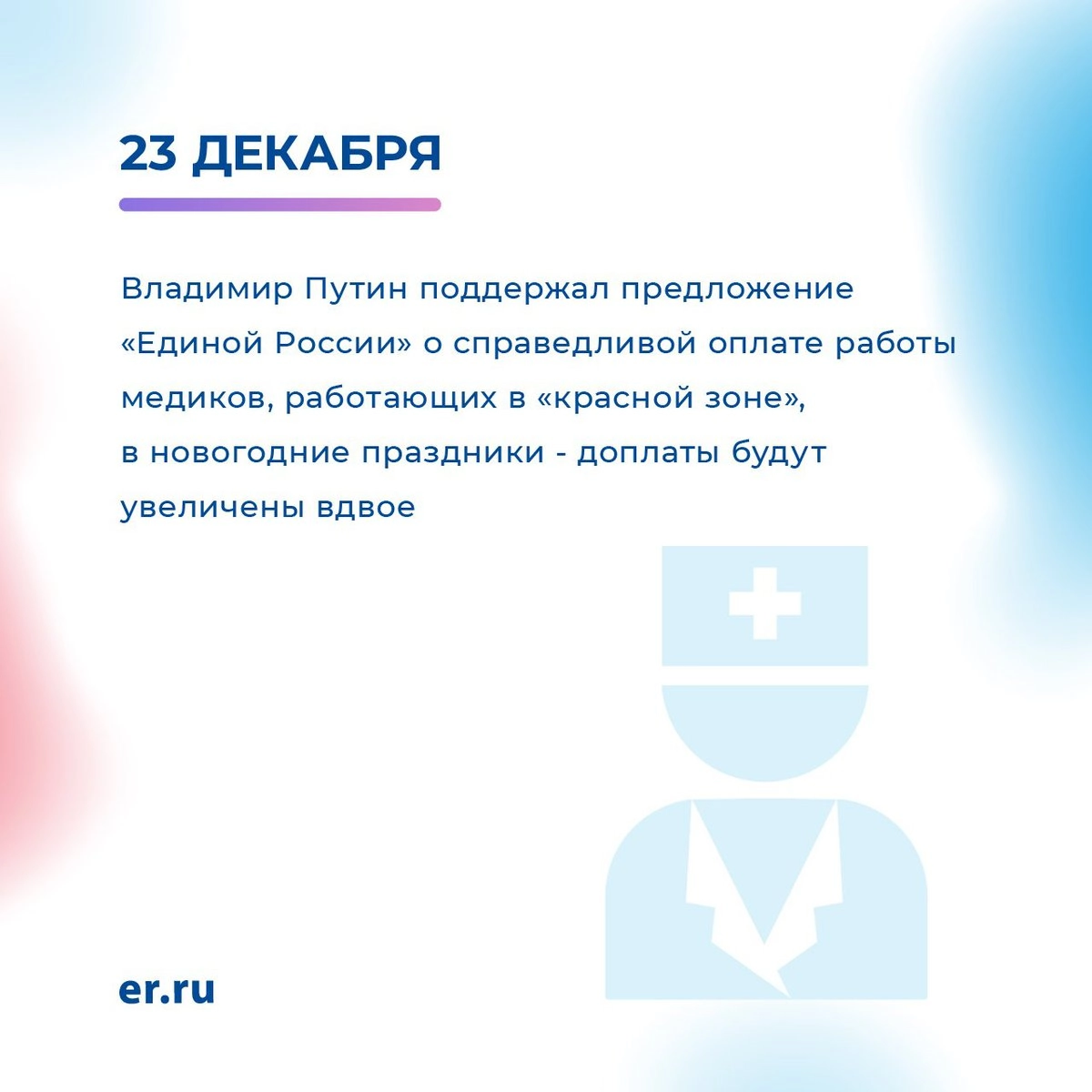 - предложение об увеличении выплат медикам, которым придется работать в новогодние праздники в «красной зоне»;