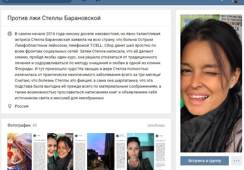 «И тут произошло чудо! На овощах и вере Стелла полностью излечилась от практически неизлечимого заболевания всего за три месяца! Считаю, что болезнь Стеллы — это фикция, а сама она шарлатанка», — пишет модератор этого сообщества.