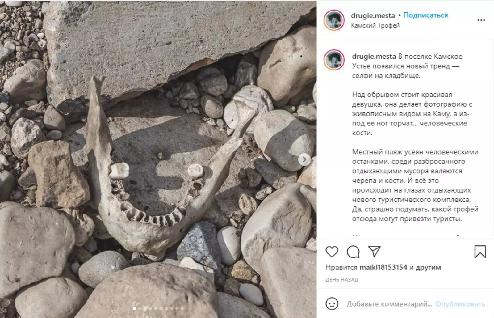Администрация Камского Устья признала, что там есть старинные захоронения, и сообщила, что будет решать эту проблему. Как она ее решит — вопрос открытый: возможно, сделают какой-нибудь мемориал, — сказал «Ридусу» Никита Перфильев.Выше по Каме, в селе Крюково в Пермском крае, на берегу реки тоже регулярно находят кости и черепа — в селе приходится даже проводить субботники по уборке останков. Во время гражданской войны Красная армия и колчаковцы вели здесь бои за переправу через Каму, и с тех пор под Крюково остались многочисленные захоронения бойцов обеих сторон, которые размывает вода Воткинского водохранилища.