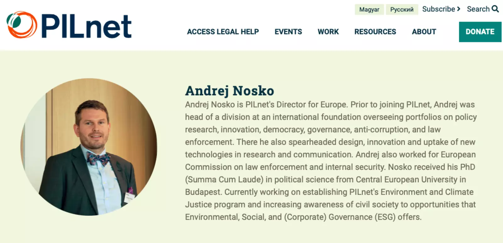 Резюме также сообщает, что его автор сейчас работает над созданием «программы PILnet по окружающей среде и климатической справедливости и повышению осведомленности гражданского общества о возможностях, предлагаемых ESG (расшифровывается как «Экология, социальное обеспечение и управление» и относится к трем центральным нефинансовым факторам измерения устойчивости инвестиций).