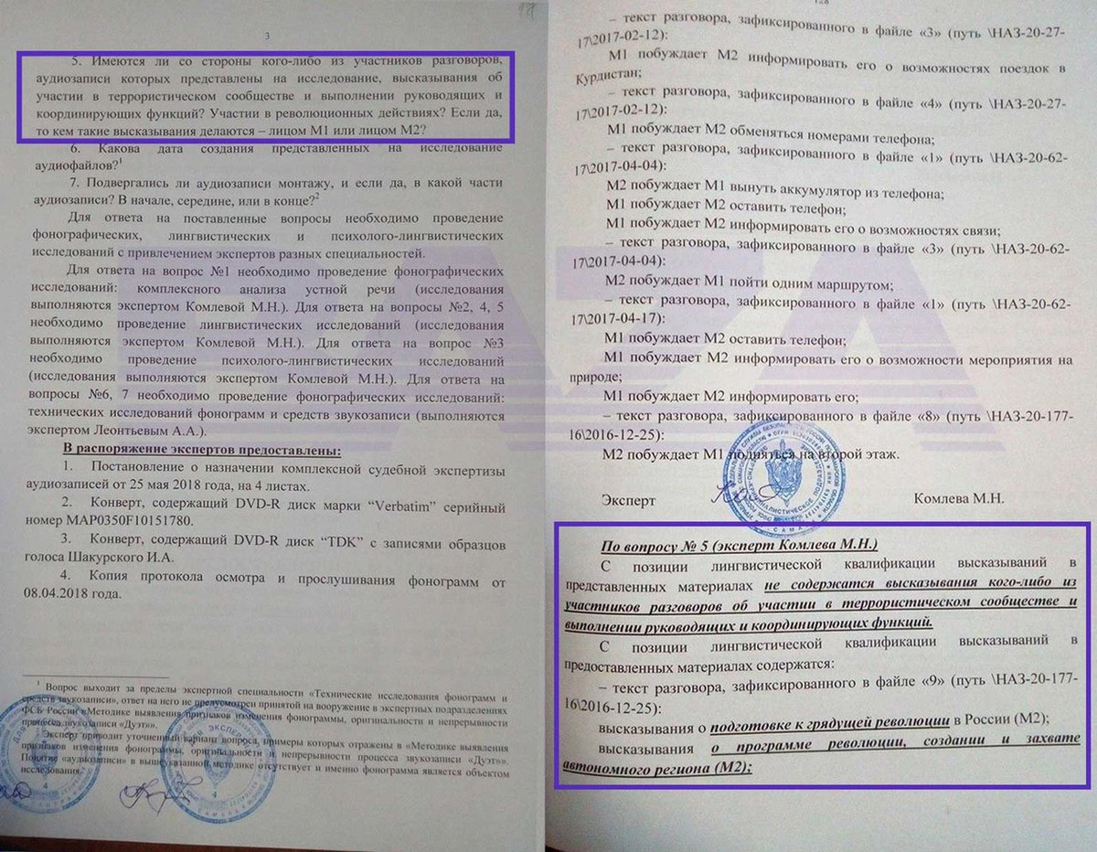 С позиции лингвистической квалификации высказываний в представленных материалах не содержатся высказывания кого-либо из участников разговоров об участии в террористическом сообществе и выполнении руководящих и координирующих функций, — гласит заключение эксперта самарского УФСБ Марии Комлевой.