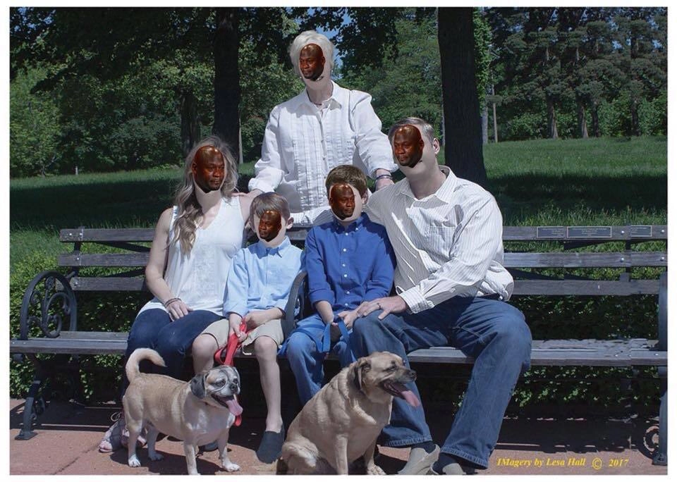 На фото присутствуют все члены семьи и две собаки. Однако лишь внешность животных не подверглась никаким изменениям. Лица людей не просто отретушированы, а будто нарисованы в специальной программе.