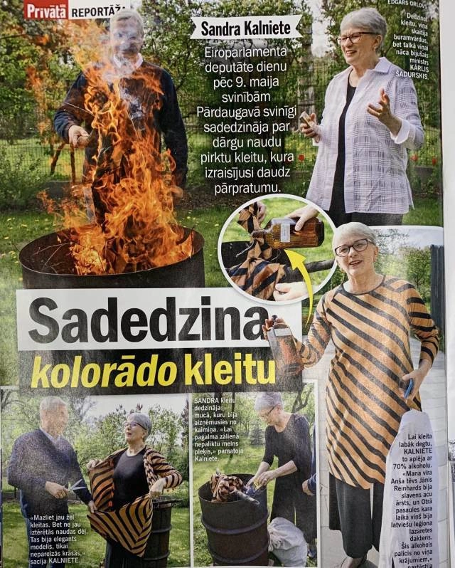 Латвийский политик, депутат Европарламента Сандра Калниете оригинально отметила 9 мая. На следующий день после праздника она провела акцию по сожжению своего черно-оранжевого платья — цветов георгиевской ленточки.