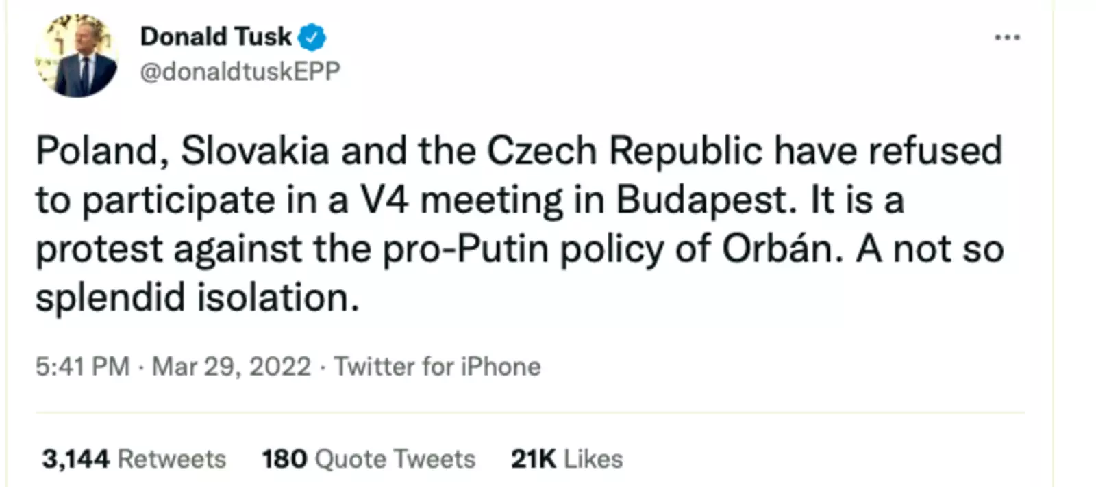 «Перед лицом гибели тысяч людей трудно понять отношение премьер-министра Венгрии Виктора Орбана, хотя он находится в тяжелом положении по собственной вине, потому что привел венгерское государство к тому, что оно практически полностью зависит от России».28 марта было объявлено, что чешский и польский министры обороны не примут участия во встрече V4 под председательством Венгрии в Будапеште в знак протеста «против дружественной путинской позиции Орбана по Украине».