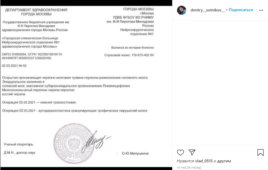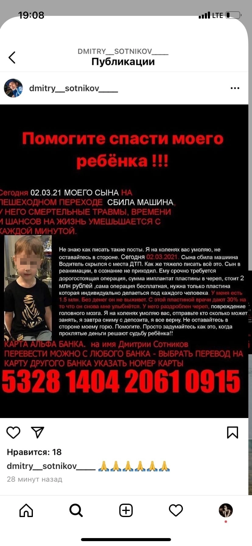 2 марта на странице гонщика внезапно появились несколько постов с фотографией его сына, личными и медицинскими документами. Их авторы от имени Сотникова сообщали, что мальчик якобы получил в ДТП потенциально смертельную черепно-мозговую травму и на его лечение требуется крупная сумма денег. Подставные реквизиты для переводов «на лечение» были опубликованы там же.
