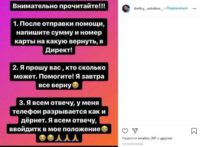 У меня действительно разрывался телефон — все знакомые переволновались, спрашивали, все ли в порядке с сыном. Некоторые подписчики даже успели перевести деньги. Тем из них, кто переводил на мой счет, я деньги вернул, — добавил Сотников.Сотников обратился в пресс-службу команды и к гонщикам, также зарегистрированным в Instagram, чтобы они оповестили Рунет об обмане. Теперь он пытается восстановить полноценный доступ к своему аккаунту.