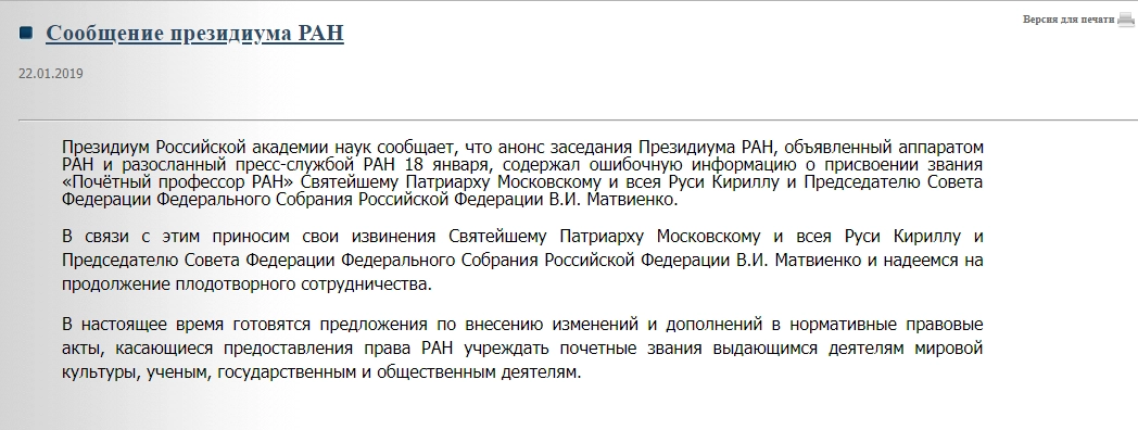 Позже президиум РАН опубликовал официальное заявление, в котором извинился перед патриархом Кириллом и Валентиной Матвиенко, назвав сообщение о присвоении почетных званий ошибочным.