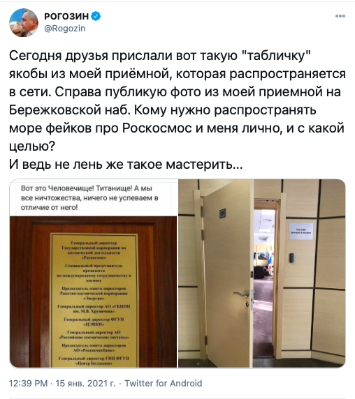 «Сегодня друзья прислали вот такую „табличку“ якобы из моей приёмной, которая распространяется в сети. Справа публикую фото из моей приемной на Бережковской наб. Кому нужно распространять море фейков про Роскосмос и меня лично, и с какой целью? И ведь не лень же такое мастерить», — написал Дмитрий Рогозин в Twitter.