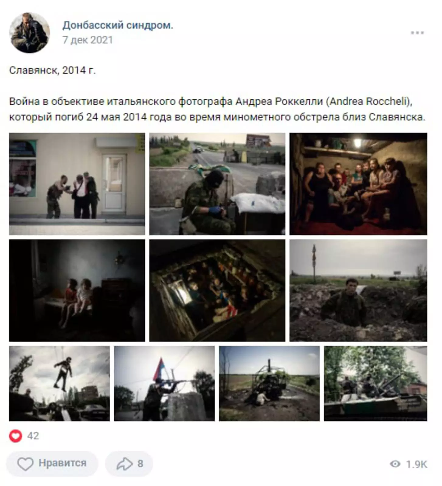 Telegram-канал «Война с фейками» узнал правду об этих снимках. Их сделал итальянский фотограф Андреа Роккелли в 2014 году в Славянске Донецкой области.