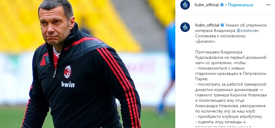 Мне, кстати, интересно, „Мегафонбет“ [имеется в виду букмекерская компания „Марафонбет“] поддерживает твои политические взгляды? Мало того, что они занимаются азартными играми, мало того, что там две хитрых схемы. Конечно, я за такое „Динамо“ болеть не могу. Я не могу болеть за „Динамо“, которое тренирует хрен знает что за тренер [Юрий Калитвинцев], у которого сынок на Майдане прыгал. И который взял украинское гражданство. Как вообще посмели его пригласить тренировать легендарное „Динамо“? — сказал Соловьев во время эфира.А 22 апреля ФК «Динамо» написал в своем Instagram-аккаунте о том, что «приглашает Соловьева на первый домашний матч со зрителями, чтобы познакомиться с новым стадионом-красавцем в Петровском Парке, а также посмотреть за работой тренерской династии коренных динамовцев — главного тренера Кирилла Новикова и помогающего ему отца Александра Новикова, рекордсмена по количеству игр за клуб».