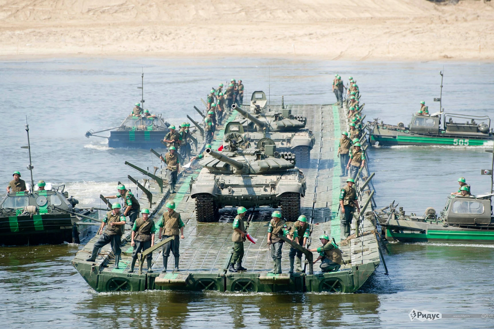 Во второй части соревнований, хотя все это походило на очень интересное шоу для рядовых граждан, начали возводить понтонные переправы. В разобранном виде - это небольшие понтоны для перевозки 40 тонн груза. На них каждая команда перевезла автомобиль, груженый боеприпасами. Надо сказать заранее, что со всеми заданиями справились все три команды, разница была лишь во времени Удачно доставив автомобиль, бойцы начали разворачивать переправу, выдерживающую 170 тонн груза. На ней перевозили на другой берег танк Т-72. И в заключение этого зрелищного соревнования соорудили переправу для двух танков, выдерживающую 340 тонн. Это и было финалом.