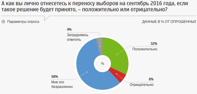 Отношение к переносу выборов на сентябрь у россиян скорее нейтрально-позитивное: для большинства не принципиально, когда проводить выборы (58%). При этом еще треть (32%) явно предпочитают выборы в сентябре, тогда как против переноса выборов на сентябрь высказались в пять раз меньше респондентов — лишь 6%.