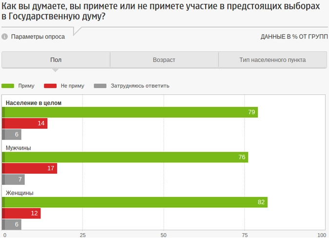 Наиболее примечательными оказались ответы респондентов на вопрос о намерении участвовать в предстоящих выборах: как выяснили социологи ФОМ, на сегодня собираются идти голосовать 79% россиян. Если учесть реальную явку на выборы в 2007 и 2011 годах — 63,8% и 60,2%, соответственно — можно констатировать значительное повышение значимости думских выборов в восприятии россиян, причем независимо от даты их проведения.