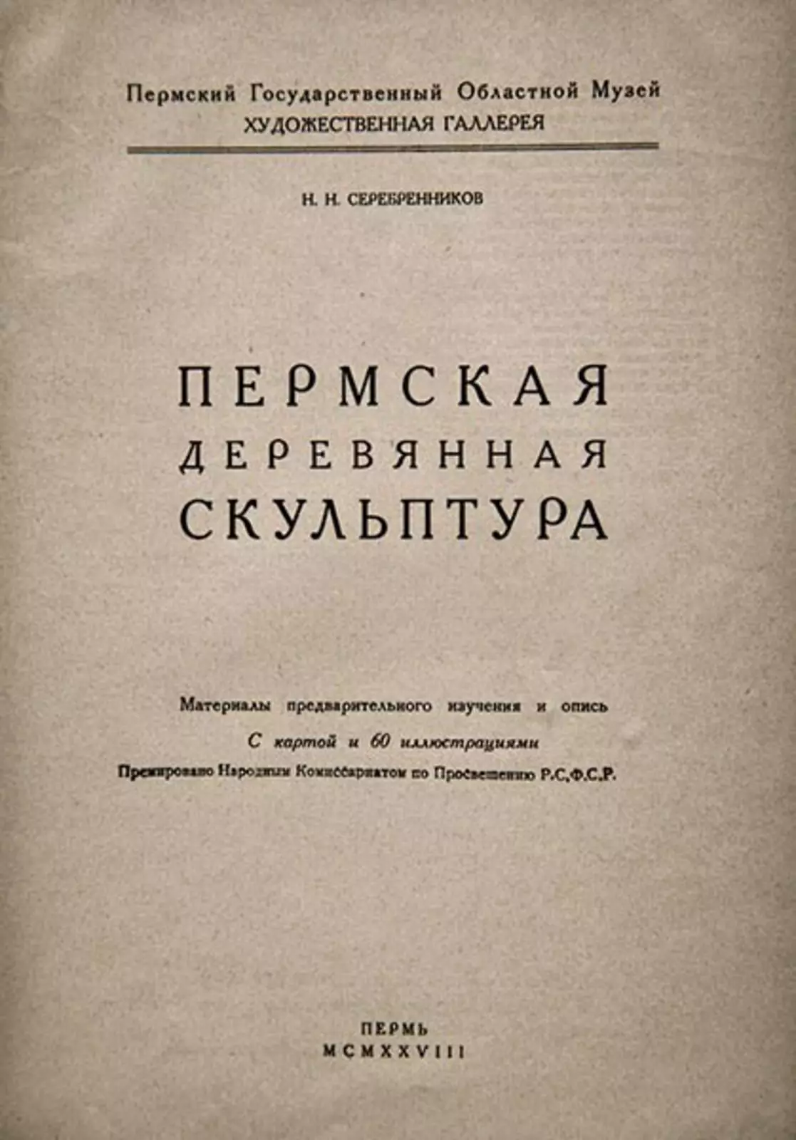 С помощью Луначарского Серебренников смог издать свою, ставшую теперь библиографической редкостью, книгу «Пермская деревянная скульптура», в которую вошли его дневниковые записи, материалы исторического характера и полный подробный каталог всех экспонатов коллекции. В 1928 г. книга вышла тиражом 1000 экземпляров, став знаменательным событием в научной и культурной жизни Советской России. Луначарский не только написал вступительную статью к этой книге, но и сразу после её выхода в свет наградил премией Народного комиссариата по просвещению РСФСР.