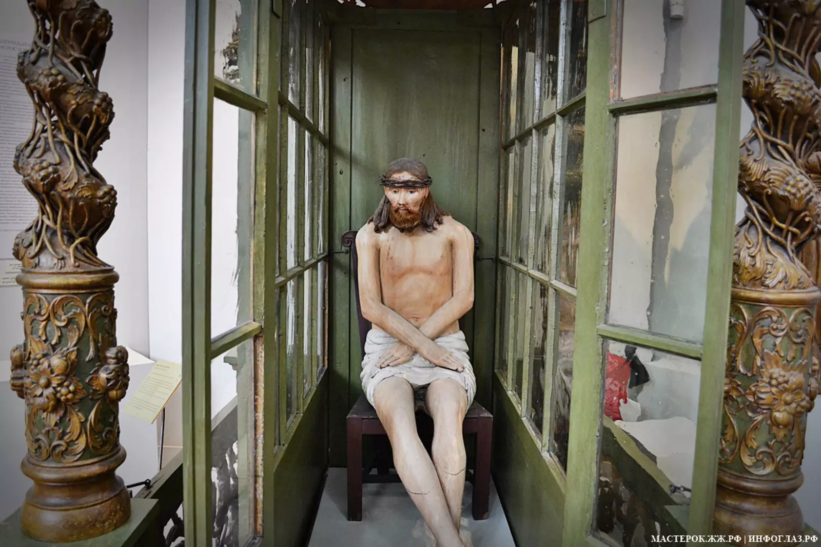 Вот посмотрите. У всех пермских статуй Христа схожие позы. Это потому, что статуи были центрами схожих по смыслу композиций «Христос в темнице». Христа окружала сама темница — тесная, тёмная комнатка. Эту «темницу», несмотря на то, что тюрьме украшения не положены, всё-таки украшали. Красивые резные рельефы, точёные столбики, статуи ангелов с орудиями страстей Христовых. У каждой из сидящих статуй Христа было подобное окружение. Статуи Христа сохранились, а всё их богатое резное окружение было утрачено.
