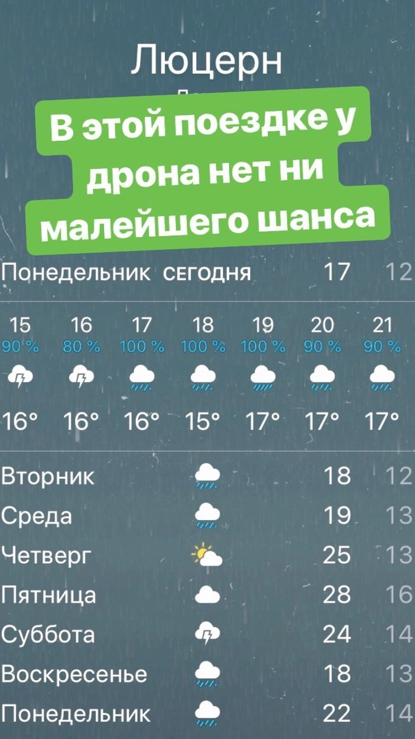 Люцерн прекрасен, хоть и весьма и весьма мокр. Поливало с короткими перерывами два дня подряд. Юниклошные дождевики наше спасение. «Июнь — идеальный месяц для поездки» говорили они, «погода будет шикарна» говорили они.