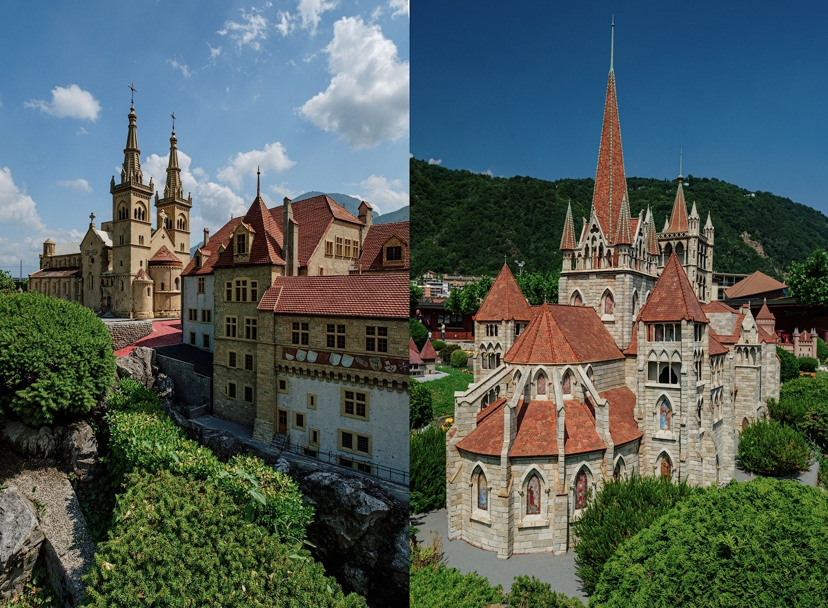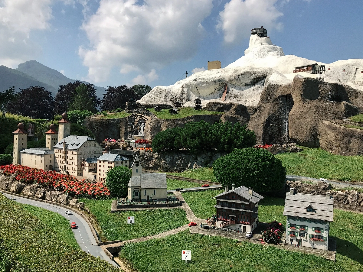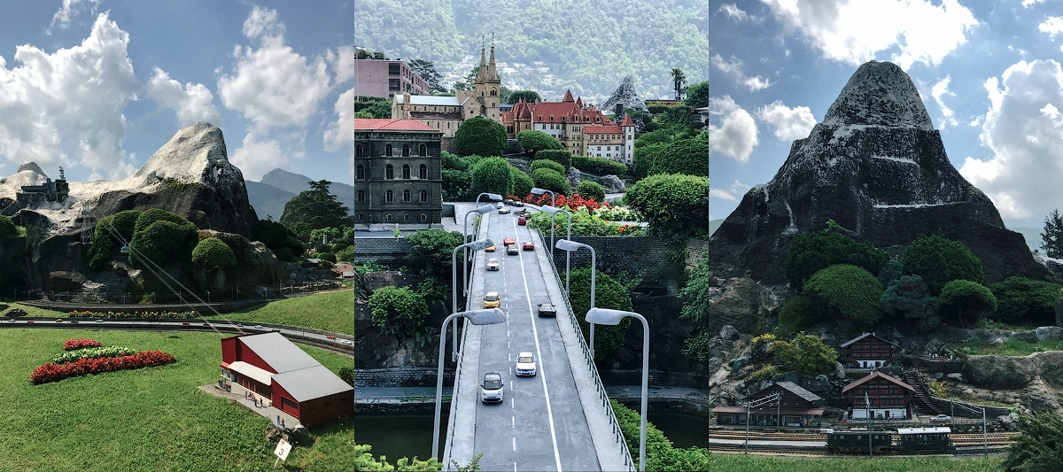 Думаете коптер наконец-то расправил крылья? Фиг там, погода так и не жалует, всего лишь парк развлечений «Швейцария в миниатюре». Увидев на входе ценник в двадцать баксов с носа начал всячески саботировать посещение данного мероприятия, что я домиков в миниатюре не видел. Но «Юлька-трэвел» была непреклонна и оказалась права, шикарное место, залипли на пару часов, пришлось даже выбегать и продлевать паркинг. Церкви, крепости, цитадели, вокзалы, аэропорт, несколько горных вершин, в буклете, что выдают на входе значатся скромные 115 пунктов на просмотр. Часть аттаркционов еще и динамические — паровозы гудят, вагончики на канатках катаются вверх-вниз, паромы и пароходы, распугивая уток носятся по рекам, машины стоят в пробках.