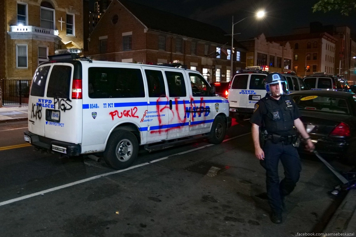 Я поехал посмотреть на манифестацию в Бруклине и на мои глазах мирный протест за несколько часов превратился в настоящее побоище с поджогами и пострадавшими. Пока целью протестующих являются только копы, но уровень агрессии и злобы такой, что все очень скоро может перейти к куда более серьезным вещам. Плюс такие события очень удобно прикрывают банальные грабежи и разбои и есть те, кто только и ждут подходящего момента.