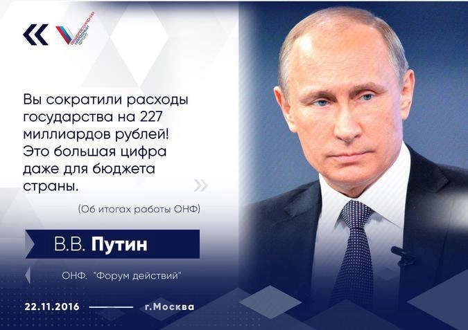 В первую очередь глава государства отметил успехи Народного фронта в борьбе с коррупцией: по словам российского лидера, при содействии «фронтовиков» было сэкономлено 227 миллиардов бюджетных средств: