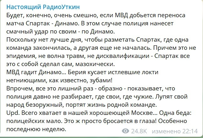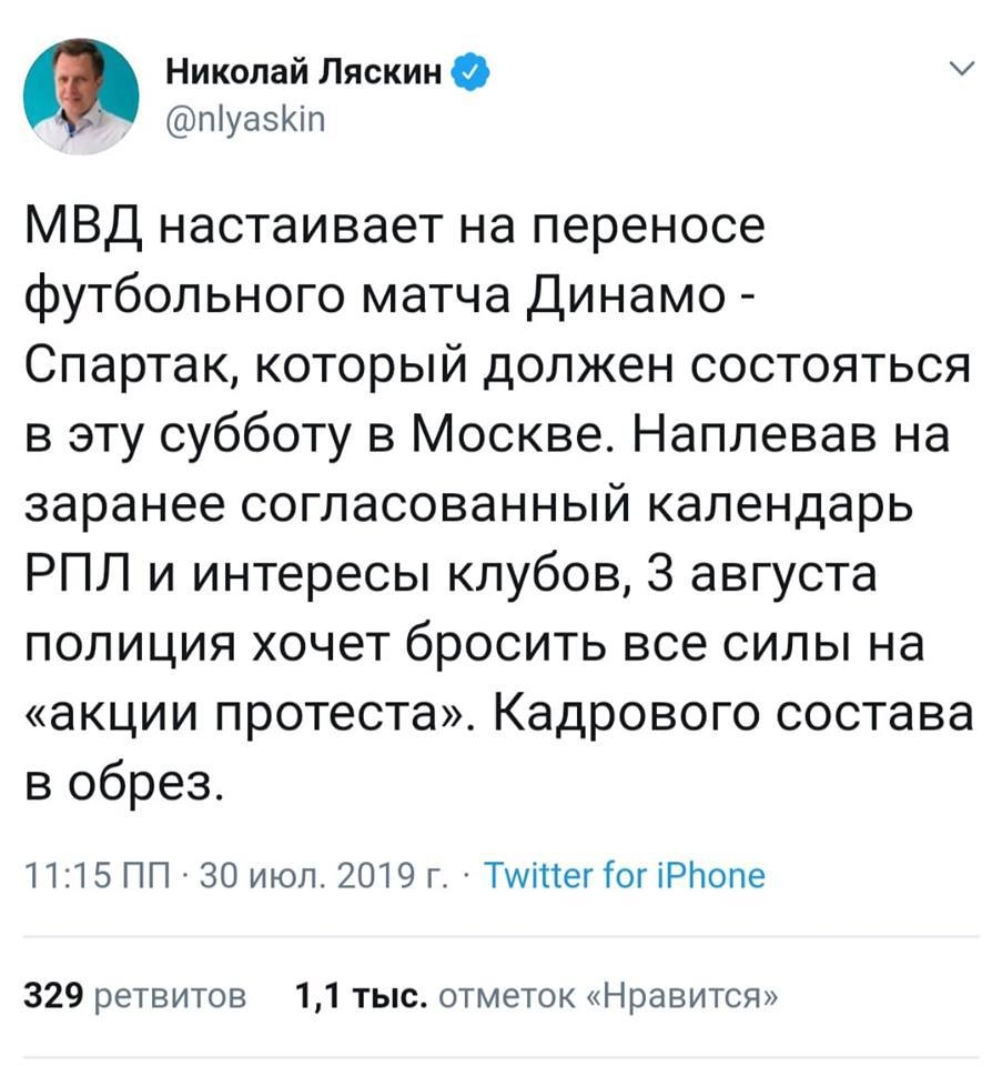 Во вторник, 30 июля, сотрудник ФБК Николай Ляскин написал в Twitter, что МВД обратилось в РПЛ с просьбой о переносе старейшего футбольного дерби страны на другой день. Причина — несанкционированный митинг, дескать, неудобно полиции гонять оппозиционеров и сдерживать футбольных фанатов в один день. Рук не хватает.