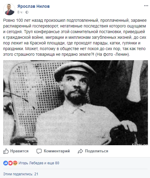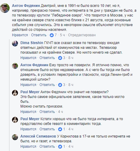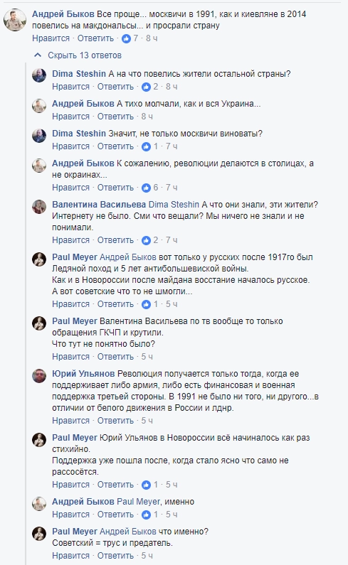 Смысл отмечать 7 ноября, пусть даже и открыточками в ФБ, если в августе 1991 года на защиту идеалов и завоеваний Революции не встал ни один коммунист «с улицы»? Иногда сталкиваешься в камментах с такими персонажами, они обычно боевые «коньки-горбунки» — визжат, показывают дули, кроют там «попов» или «Николашку Кровавого с царицей-немкой». А спросишь его так в лоб: «Где был в августе 1991 года?». Интернет-коммунист сразу рвется и говорит так тихо: «На территории воинской части, ждал приказа» или «смотрел телевизор» или «был в момент капиталистического переворота мутной каплей биоматериала,негодует господин Стешин на личной странице в Facebook (пунктуация и орфография сохранены).В дополнение журналист отмечает, что СССР ему жалко.
