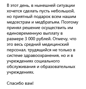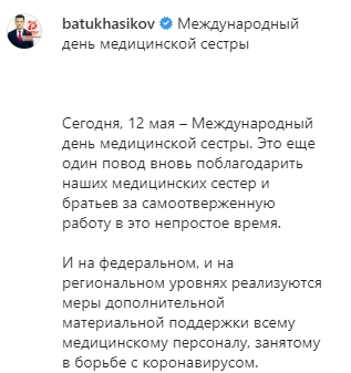 В этот день, в нынешней ситуации хочется сделать пусть небольшой, но приятный подарок всем нашим медсестрам и медбратьям. Поэтому принял решение осуществить им единовременную выплату в размере трех тысяч рублей. Отмечу, что это весь средний медицинский персонал, трудящийся не только в системе здравоохранения, но и в учреждениях социального обслуживания и образовательных учреждениях, — написал глава республики в своем Instagram-аккаунте.