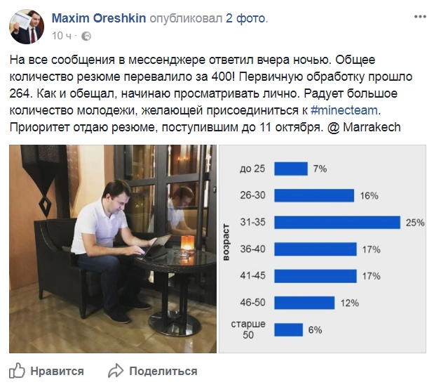 Министр экономического развития Максим Орешкин сообщил, что получил в Facebook более тысячи резюме. Ранее он попросил желающих работать в ведомстве присылать анкеты лично ему. При этом за выходные ему поступило около 400 сообщений.