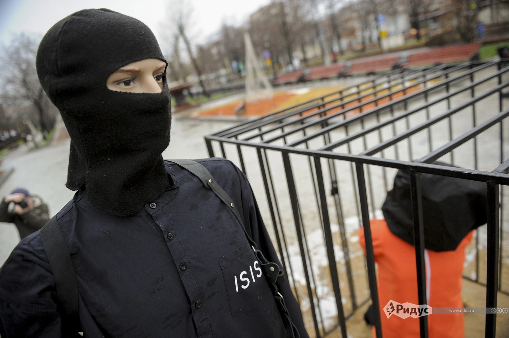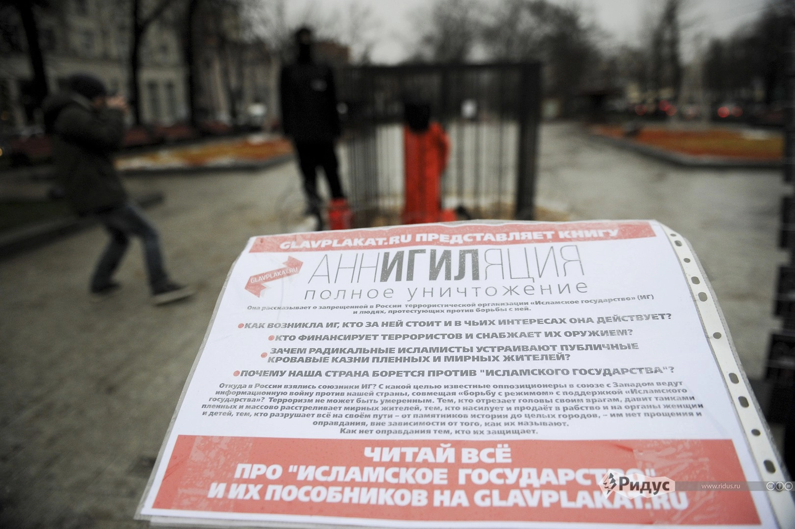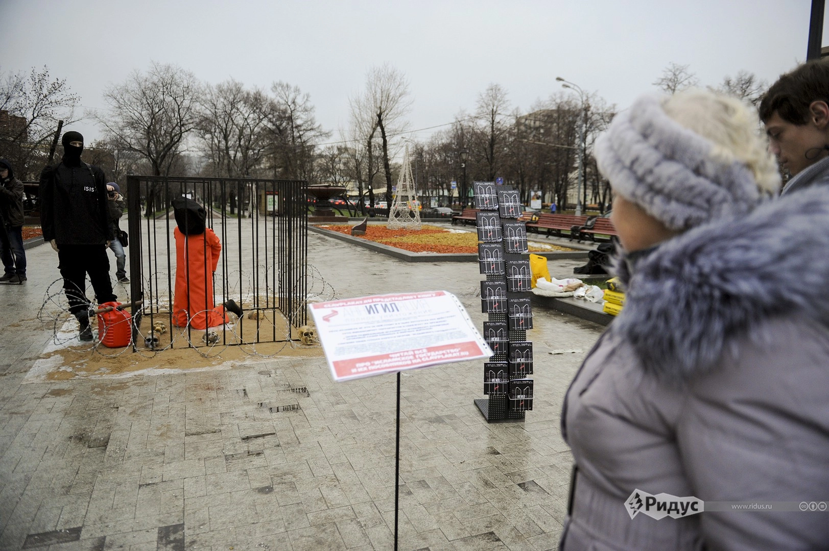 Презентация прошла в самом центре Москвы в форме инсталляции, призванной просветить граждан, почему Россия вынуждена сегодня бомбить позиции боевиков «Исламского государства».
