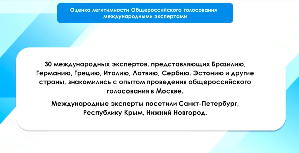 1. Из-за пандемии коронавируса процесс волеизъявления граждан длился неделю: с 25 июня по 1 июля. Как рассказал глава рабочей группы ОП РФ по общественному контролю за голосованием Максим Григорьев, это позволило избежать скопления людей на участках, а значит, сделать голосование максимально безопасным для здоровья россиян.