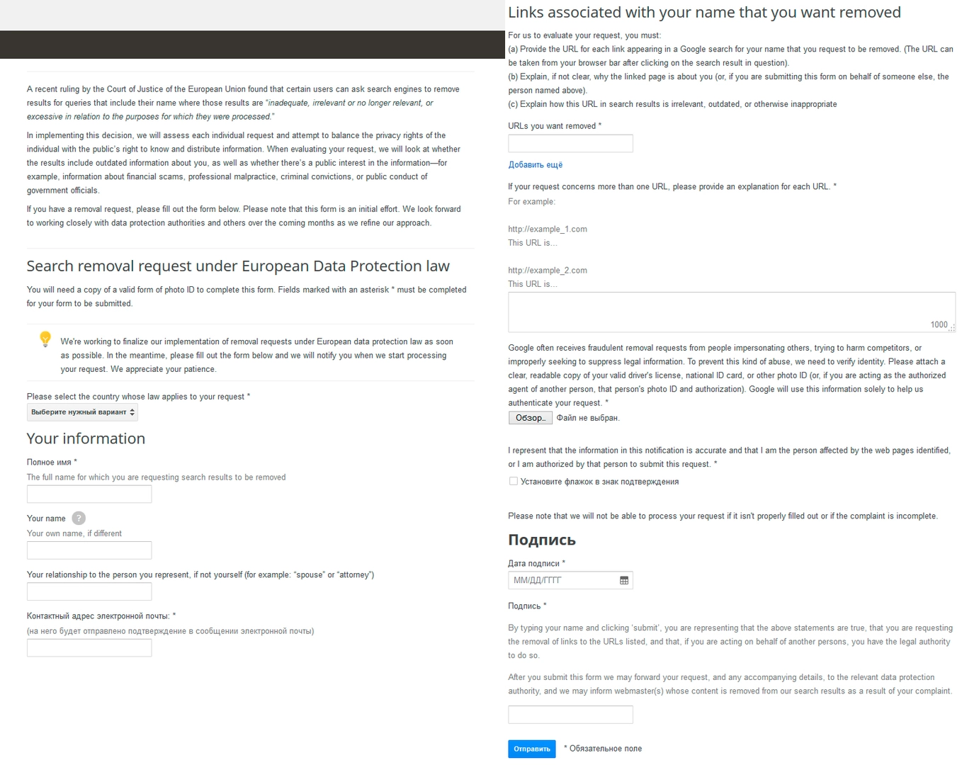 Форма онлайн-заявления для европейцев, желающих удаления данных о себе из результатов интернет-поиска, подготовлена и размещена компанией «Google» после решения Европейского суда, который 13 мая постановил, что пользователи вправе попросить стереть информацию, если она «неуместна или неактуальна».