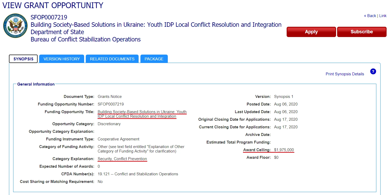 Судя по описанию гранта, США намерены содействовать «снижению уровня уязвимости вынужденных переселенцев и недопущению раскола украинского общества со стороны России». Для этого грантополучатель должен реализовать ряд мер «по предотвращению российской дезинформации на территории Украины».