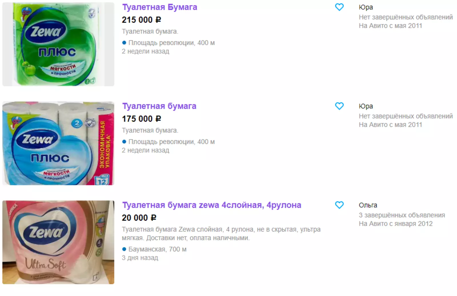 Продавцы на «Авито» предлагают завидный ассортимент туалетной бумаги, которую смели с полок супермакетов встревоженные россияне. Цены доходят до 215 тысяч рублей. Продавцы предпочитают наличные.