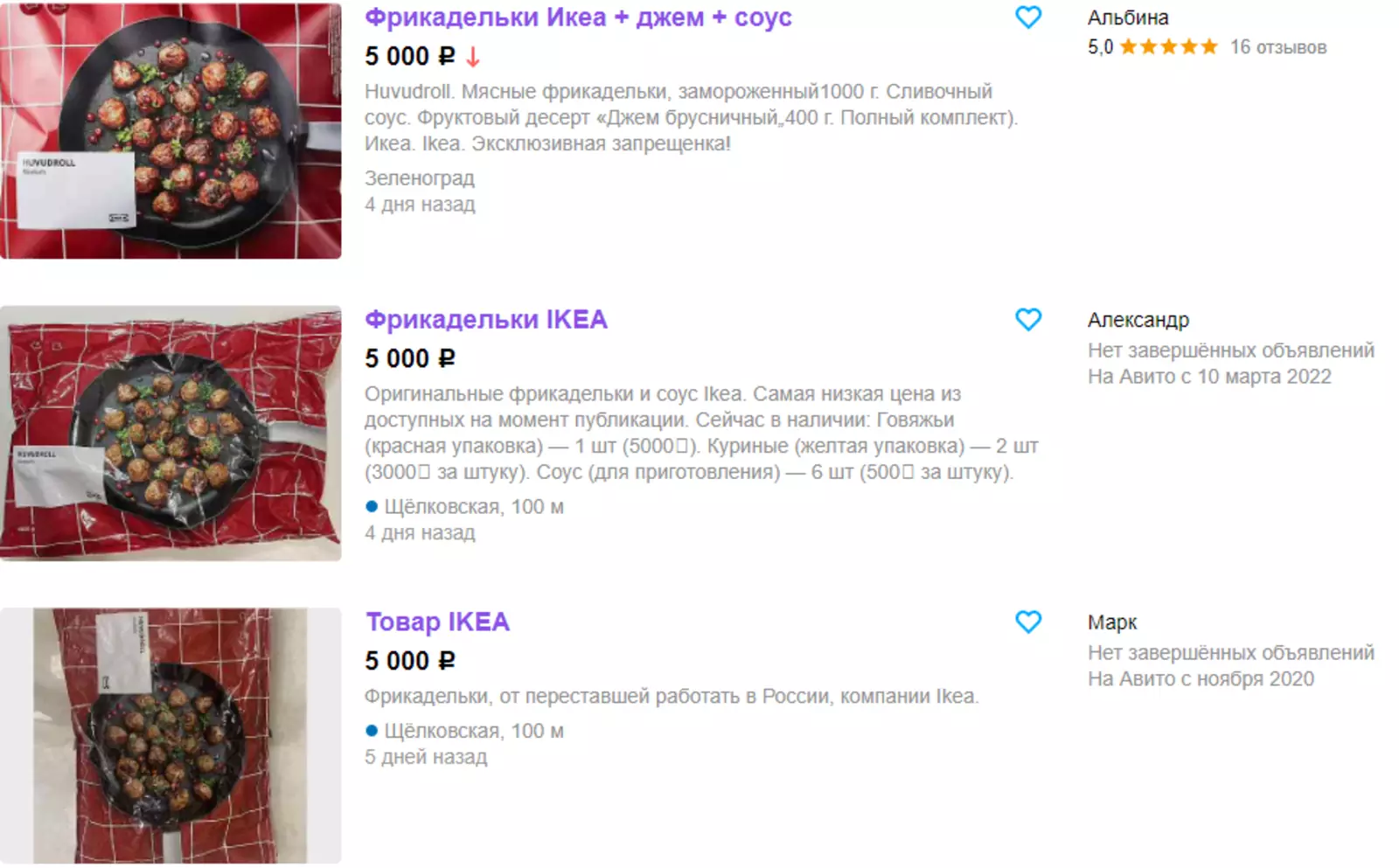 В соседних объявлениях можно отыскать сироп бузины из IKEA за 200 тысяч или напиток с пряностями Vintersaga за 55 тысяч. Фирменных мясных фрикаделек в продаже на «Авито» тоже предостаточно — и цены у них демократичные по местным меркам.