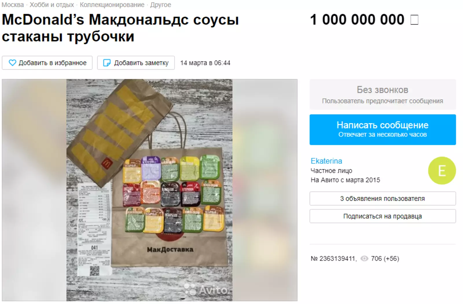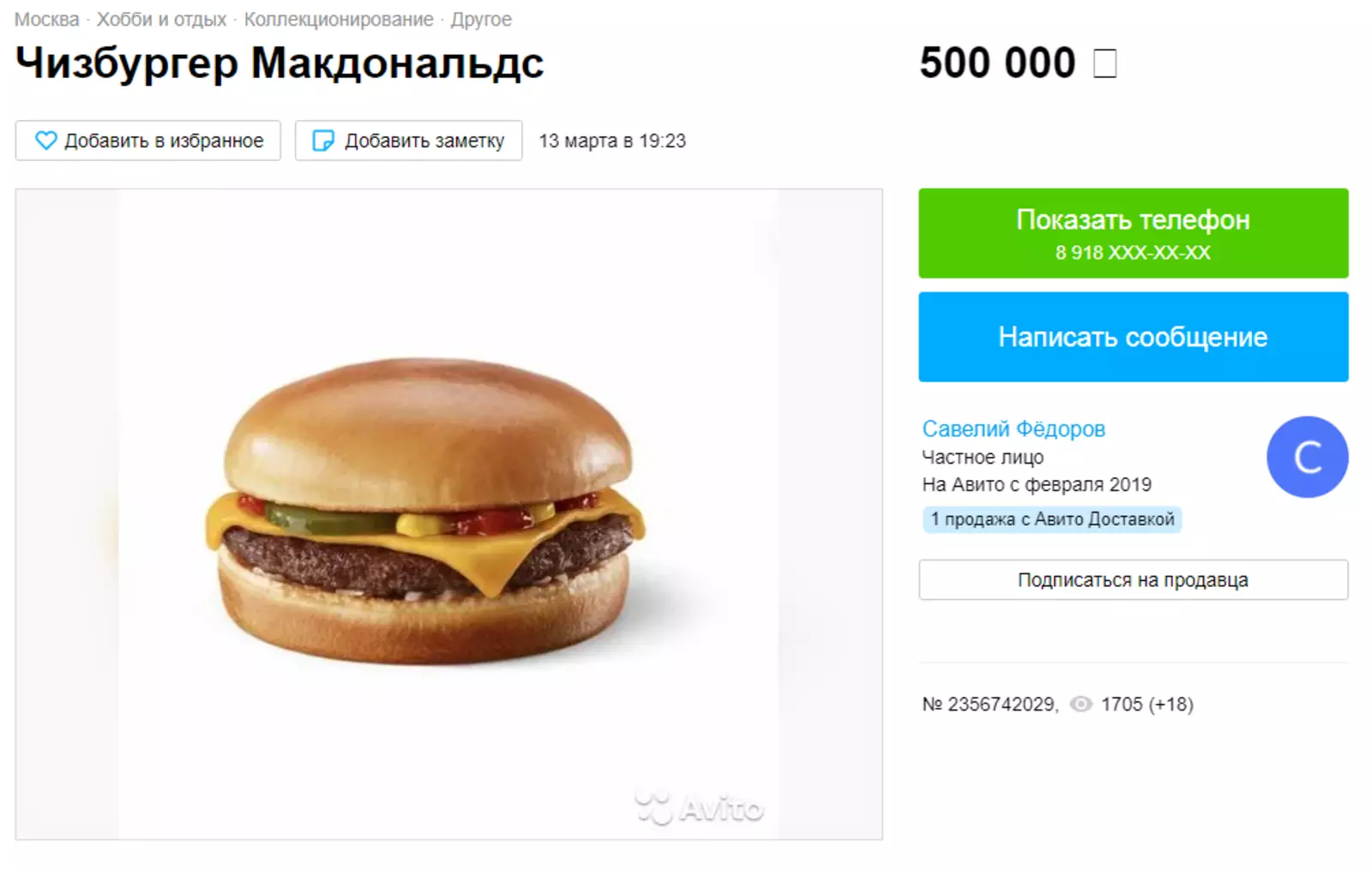 «Объявление для тех, кто любит радовать себя и близких, а может просто быть в центре внимания любой компании и королем/королевой эпатажа! Может вам понадобился живой и самое главное вкусный реквизит продукции „Макдоналдс“ для вашего YouTube-проекта. Узнали себя? Тогда у меня для вас уникальное предложение: тот самый чизбургер из „Макдоналдс“ в вакуумной упаковке, который был подвергнут шоковой заморозке уже через 10 минут после покупки. Заказ доставляется в течение часа после оплаты в фирменном пакете с салфетками», — гласит объявление.