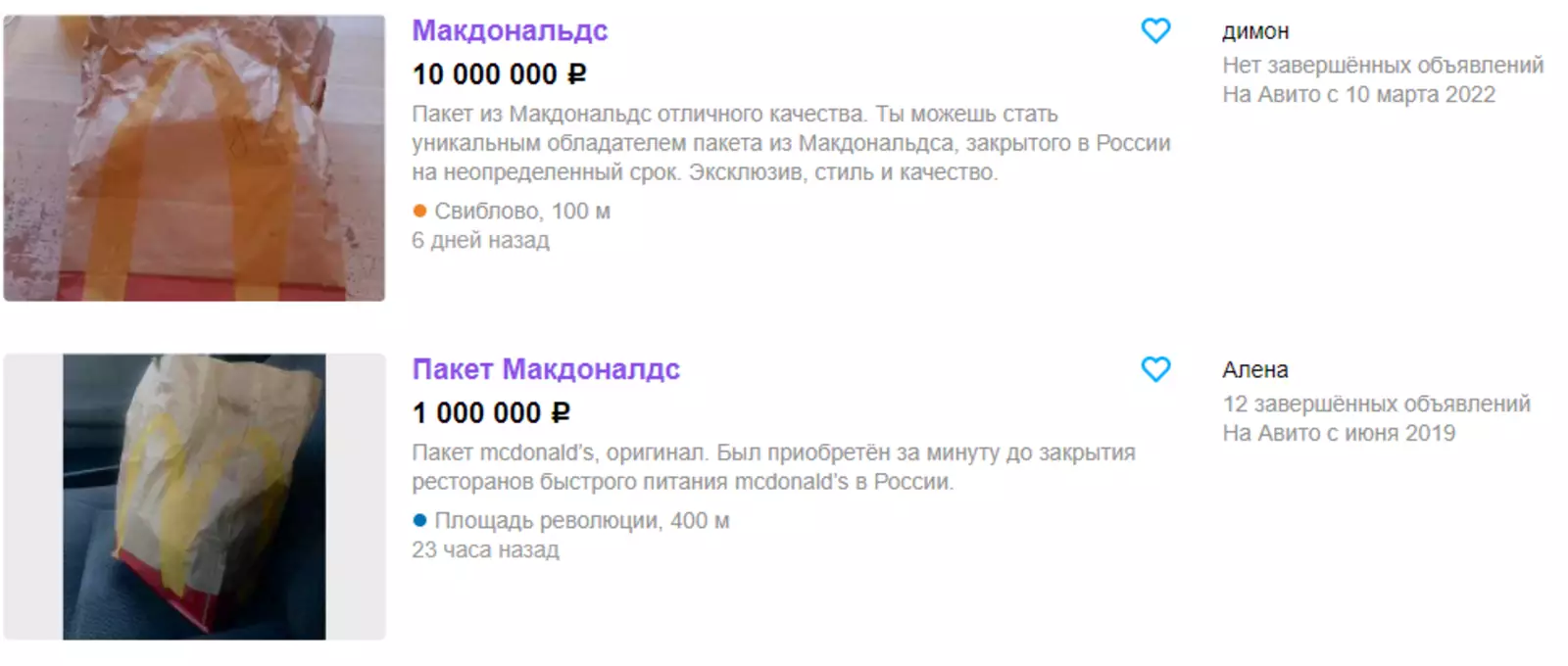 Самые поразительные цены можно найти в объявлениях о продаже товаров и продуктов из покинувшего Россию «Макдоналдс».