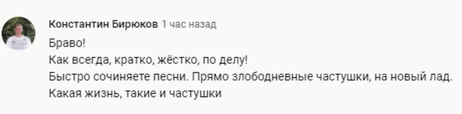 «Нас приучат к этой дисциплине, и не пощадят ведь никого. Да, русский —как еврей теперь в Берлине, в 1940-ом. У врача однако надпись: „Кабинет. Русским и собакам — входа нет“», — поет Сергей Шнуров.