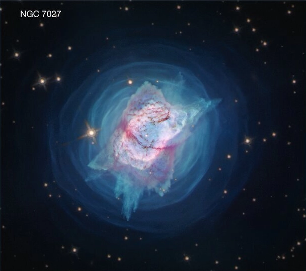 Второе изображение туманности NGC 7027 указывает на более спокойное ее состояние. Она медленно раздувает свою массу в спиральные узоры в течение многих веков. Однако недавно что-то пошло не так, и туманность активизировалась, что можно заметить по характерному изображению в центре.
