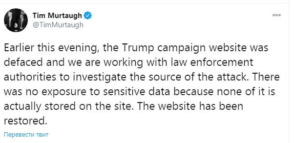 «Ранее этим вечером сайт кампании Трампа был поврежден, и мы работаем с правоохранительными органами над поиском источника атаки. Не было доступа к конфиденциальным данным, потому что они фактически не хранятся на сайте», — написал Мертоу в Twitter.
