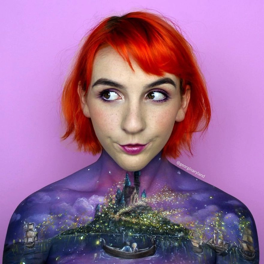 Джорджина Райленд (Georgina Ryland), талантливая визажистка из австралийского Брисбена, прославилась тем, что, используя свою кожу как холст, изображает на теле настоящие произведения искусства. Девушка прошла обучение в художественной школе, а затем заинтересовалась боди-артом. Первыми её известными в интернете работами стали крошечные рисунки, нанесённые на веки.